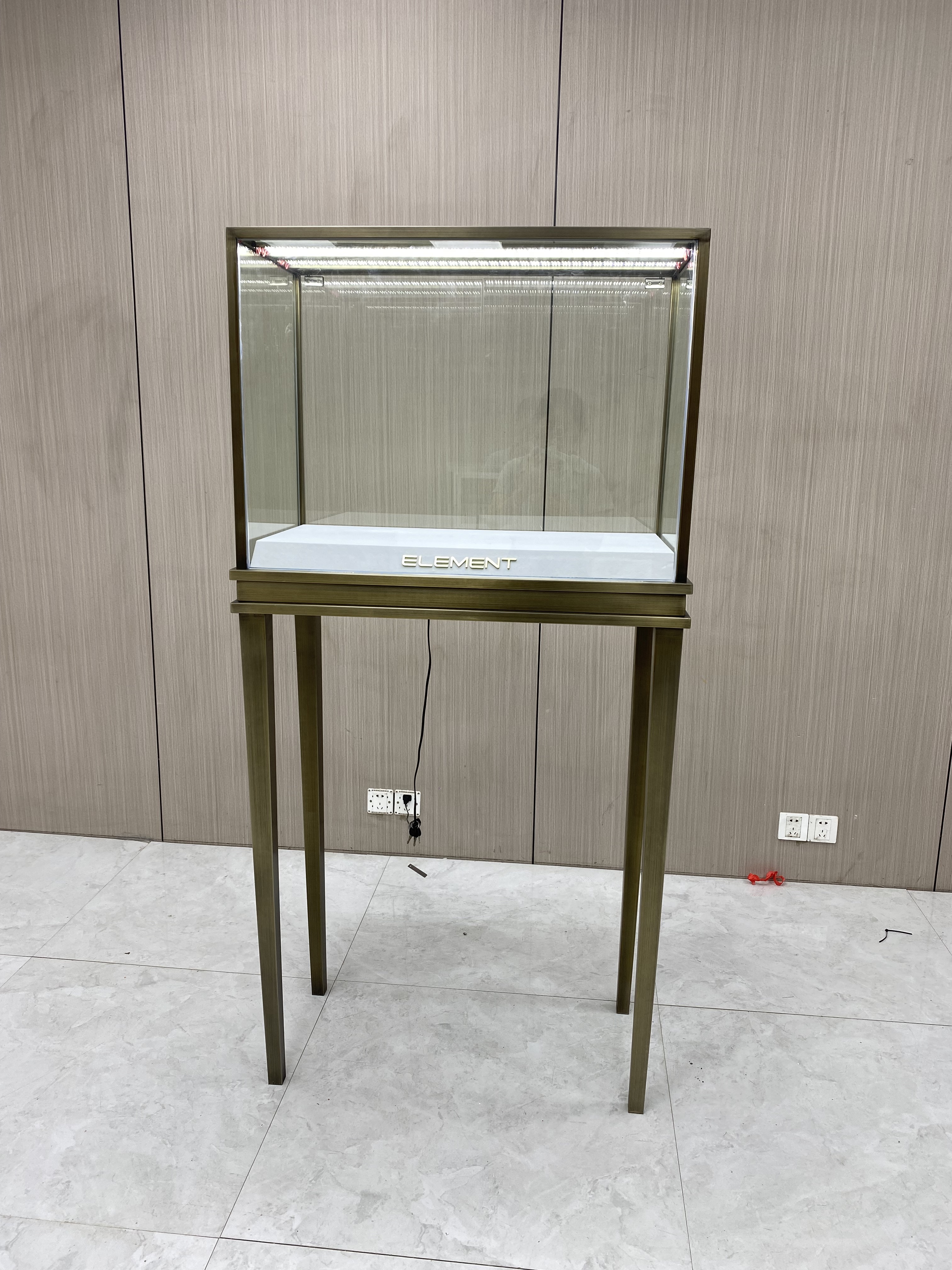 A empresa possui produtos de gabinete de exibição de jóias de bronze.