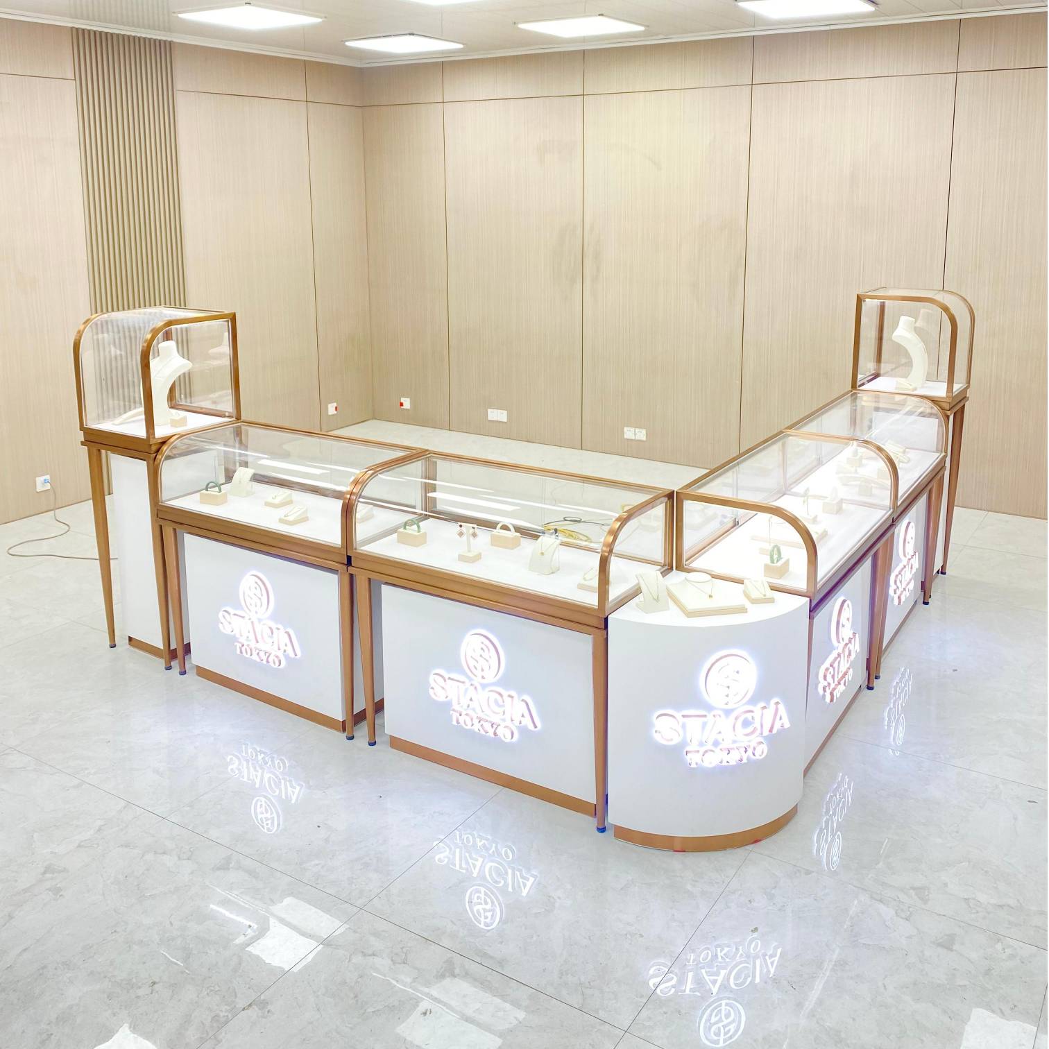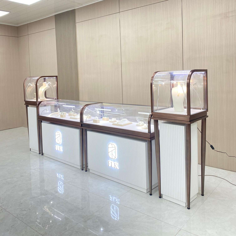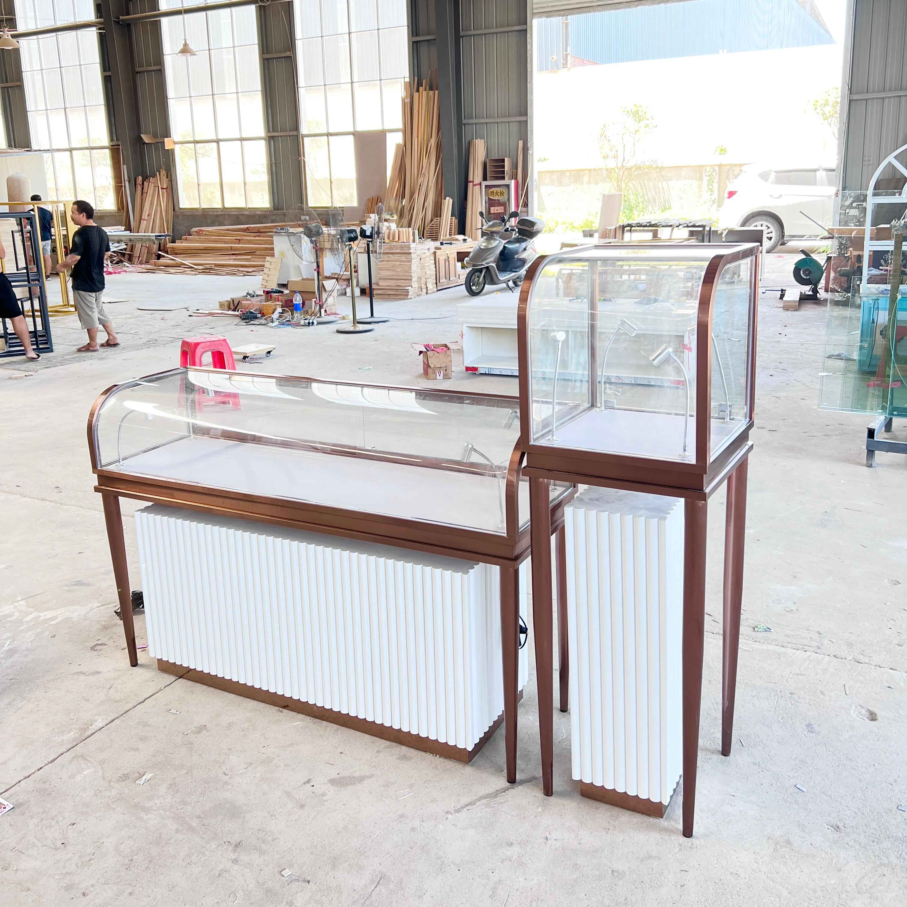 Este armário de exibição de jóias personalizadas, criado a partir de aço inoxidável com um acabamento escovado de ouro rosa, exala elegância e luxo. O tamanho da frente é L120*W55*H95CM.O tamanho da vertical Isl55*W55*H140cm.O cot -copo não apenas adiciona um toque estiloso, mas também oferece uma excelente vista da jóia. Você pode adicionar logotipos, permitindo que as empresas o adaptem à marca deles, um grande benefício para as empresas de joias atacadistas de shoppings. O aço inoxidável garante a durabilidade. O tom de ouro rosa e o vidro curvo aumentam o apelo visual, atraindo clientes. A personalização aprimora ainda mais a visibilidade da marca. Em curta, é uma escolha perfeita para os varejistas de jóias que desejam uma tela funcional, elegante e para melhorar a marca.