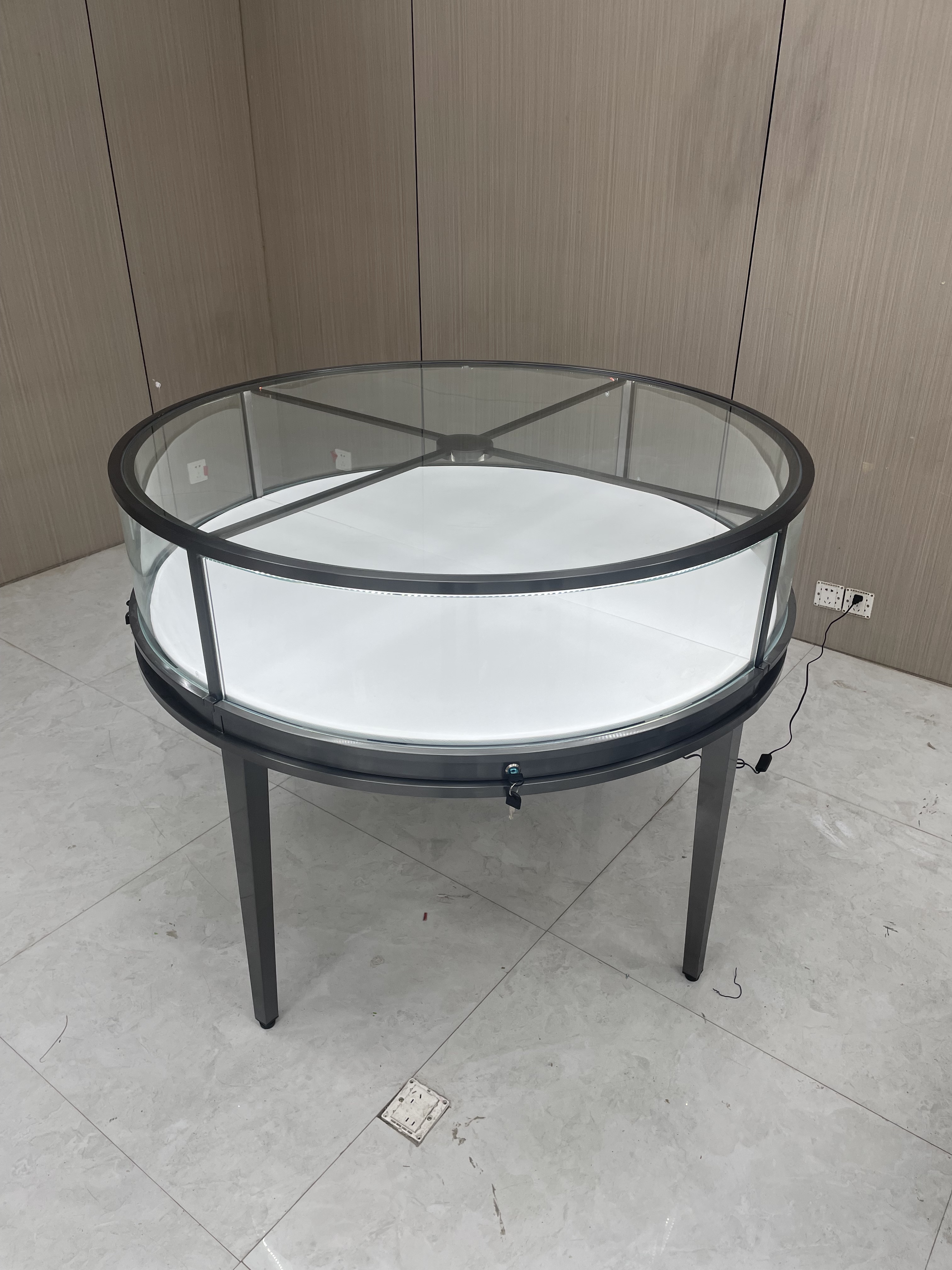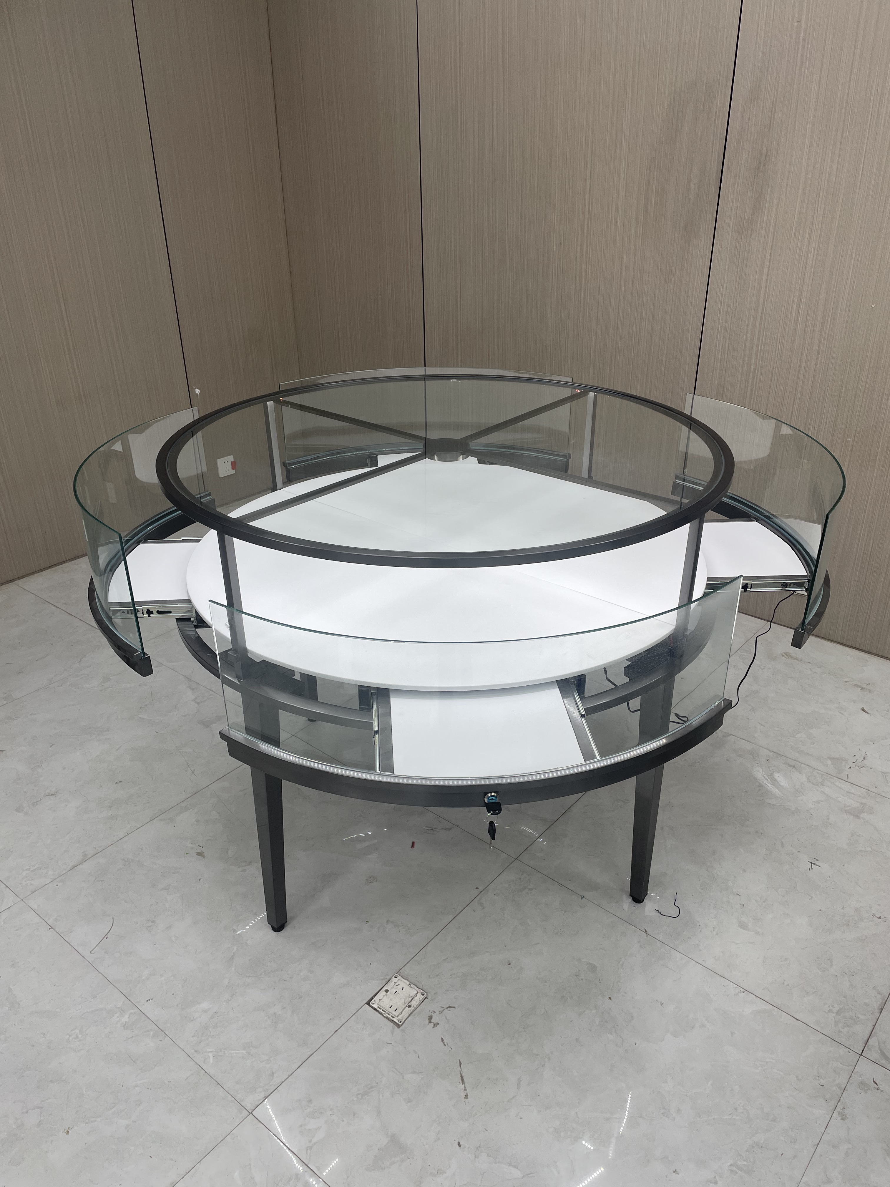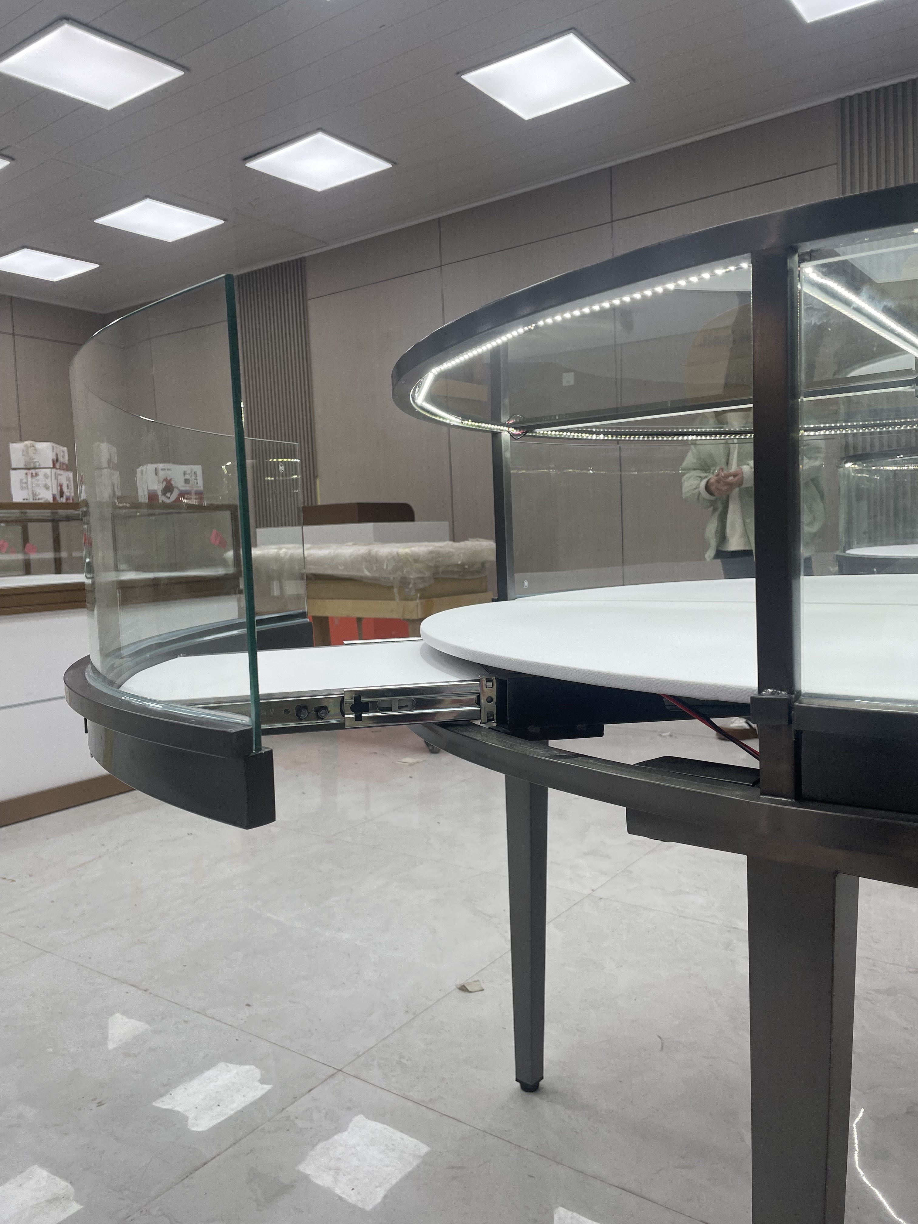 R: O gabinete de exibição é redondo, com dimensões de 1220cm × 120cm × 95cm, oferecendo amplo espaço para jóias, mantendo uma aparência elegante e compacta.
