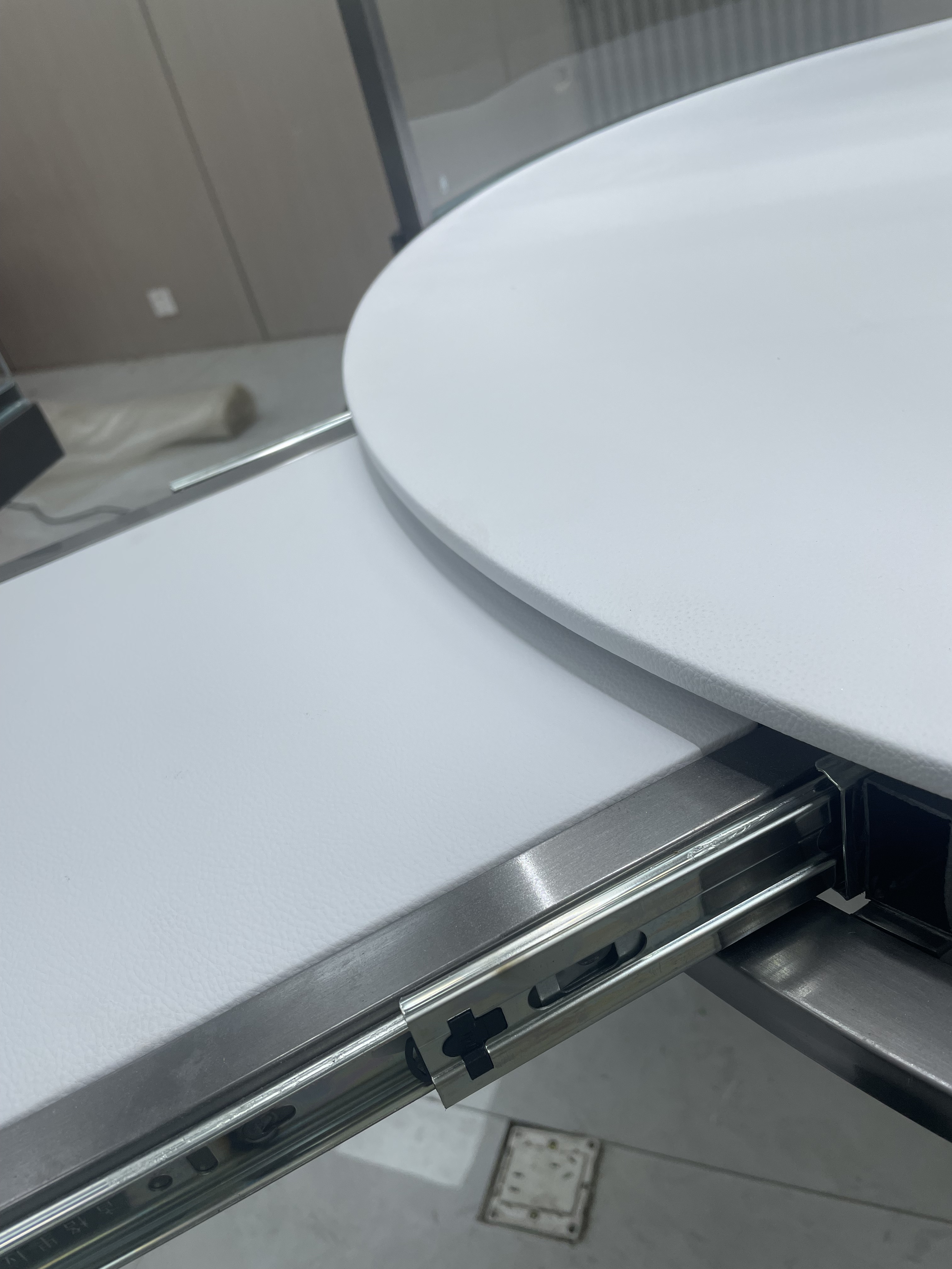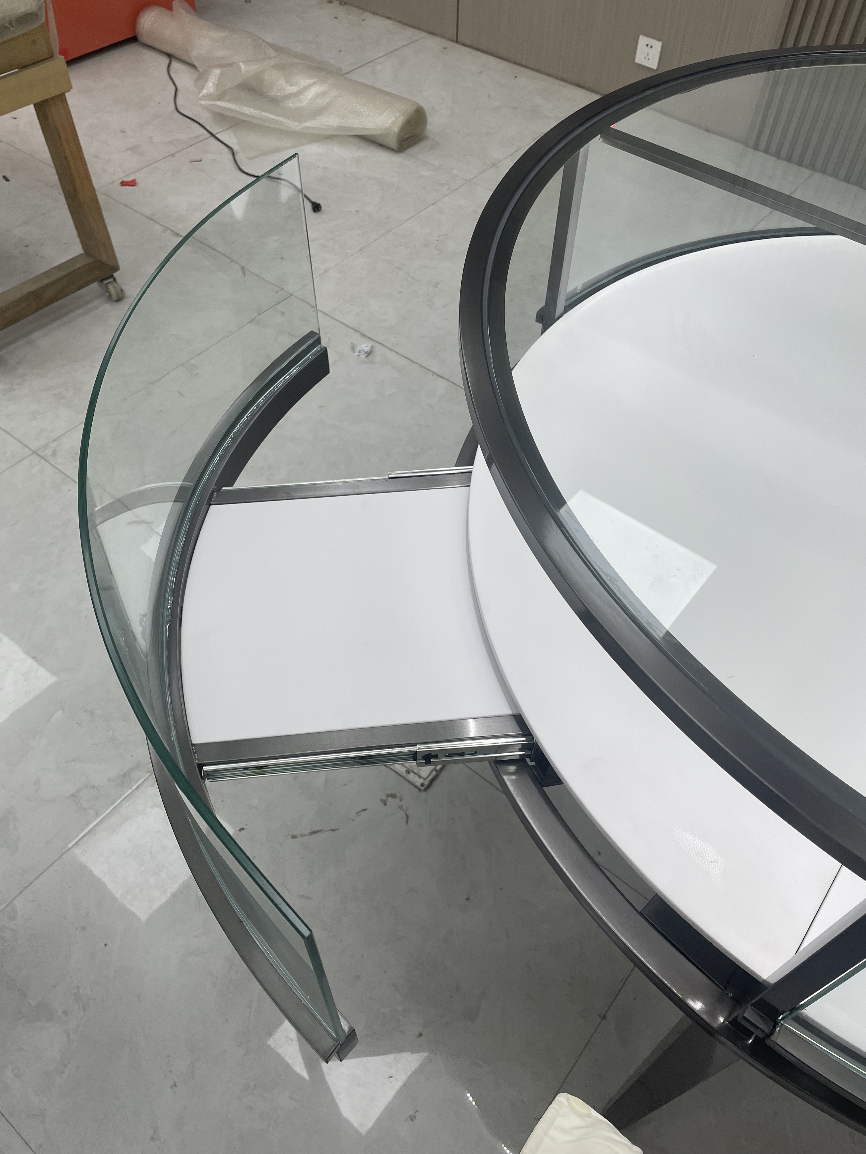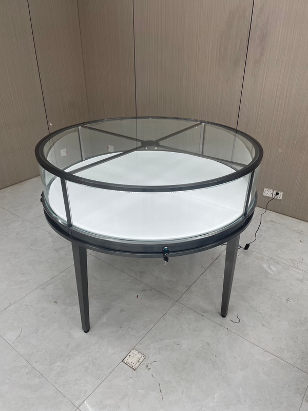 R: O gabinete de exibição é redondo, com dimensões de 1220cm × 120cm × 95cm, oferecendo amplo espaço para jóias, mantendo uma aparência elegante e compacta.