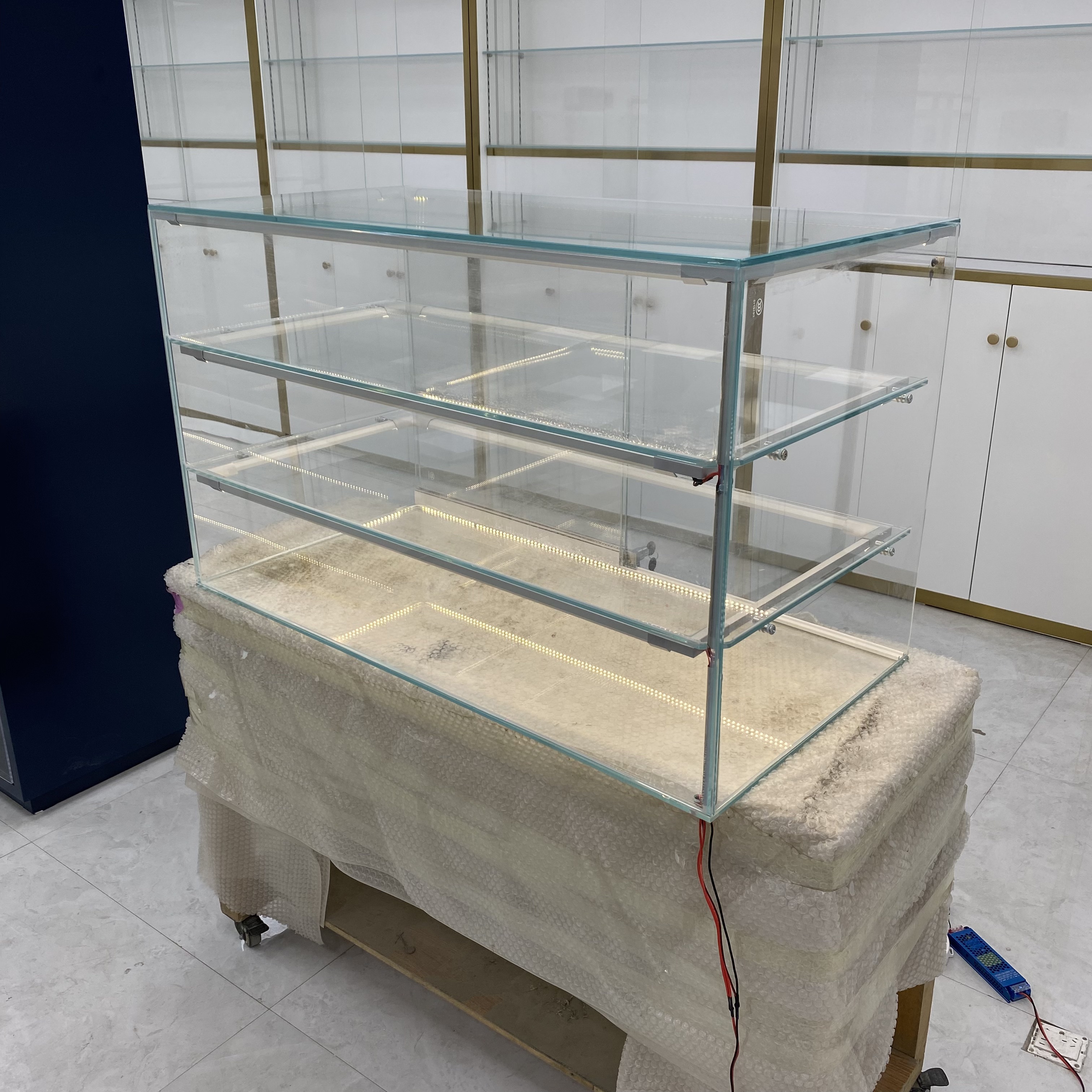 A empresa possui produtos de gabinete de exibição de pão de vidro.