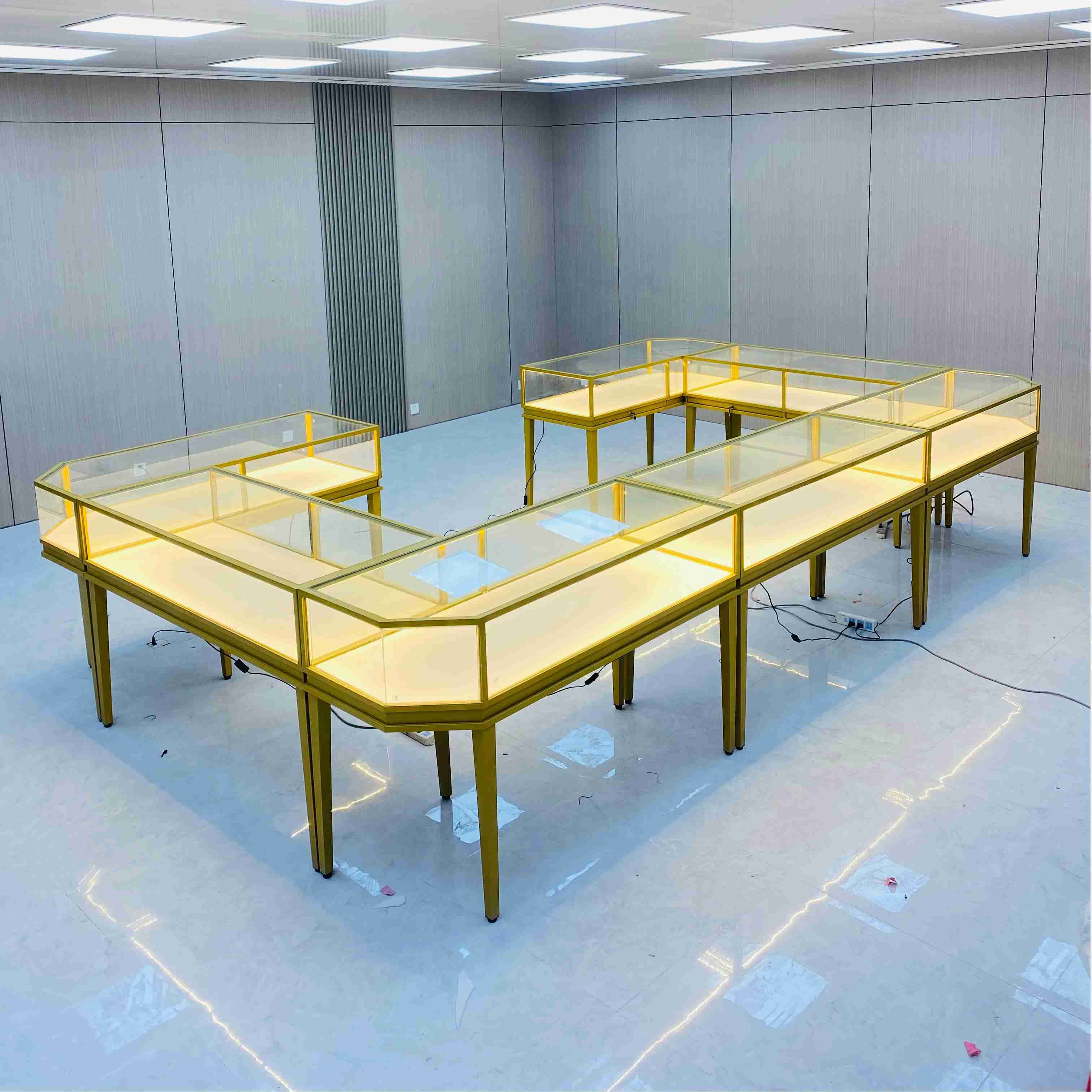 Nosso gabinete de exibição de jóias da moda 3M*4M é a escolha ideal para o varejo. Compreendendo seis armários de base pretos L120*W55*H95cm, possui uma moldura de ouro elegante e vidro temperado transparente de 8 mm. Os armários base oferecem a opção de logotipos personalizados, aprimorando a visibilidade da marca. Seu design elegante não apenas mostra as jóias lindamente, mas também adiciona um toque de elegância a qualquer espaço de varejo.