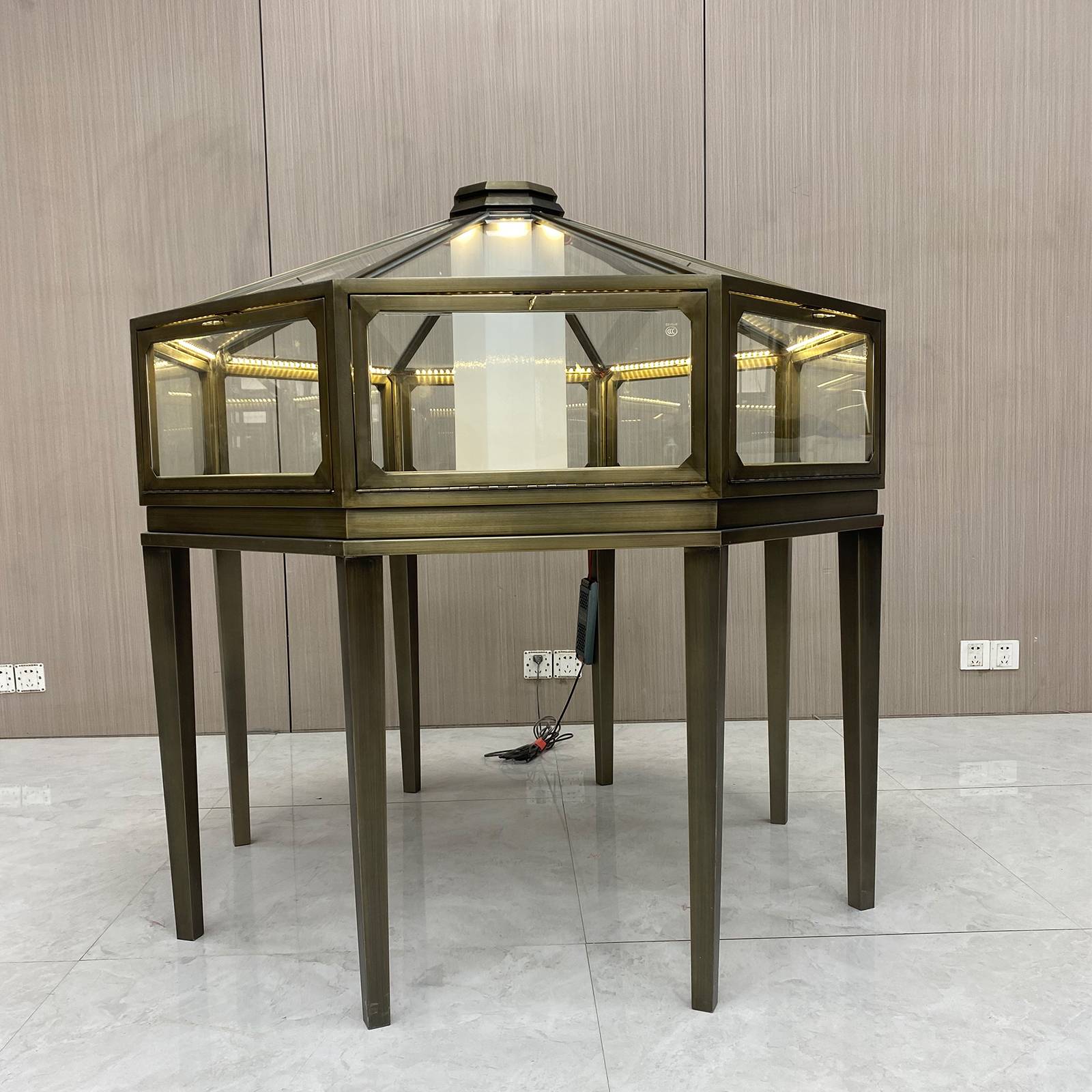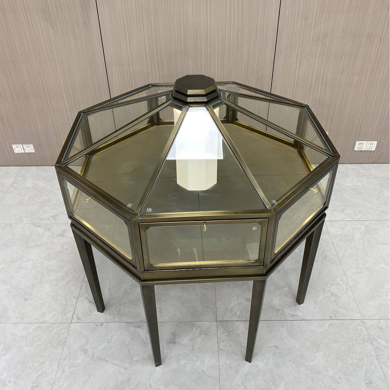 Este gabinete de exibição de jóias da moda é altamente durável. O tamanho é L120*W120*95CM.T é feito de aço inoxidável colorido de bronze com um acabamento escovado, o que não apenas dá uma aparência elegante, mas também garante sua robustez e resistência ao desgaste. O gabinete possui vidro temperado transparente de 8 mm. Esse tipo de vidro é conhecido por sua resistência e durabilidade, capaz de suportar impactos e fornecer uma visão clara e desobstruída das jóias dentro. A combinação da estrutura robusta de aço inoxidável e o vidro temperado resistente fazem deste gabinete de exibição uma escolha duradoura e confiável para mostrar jóias da moda.