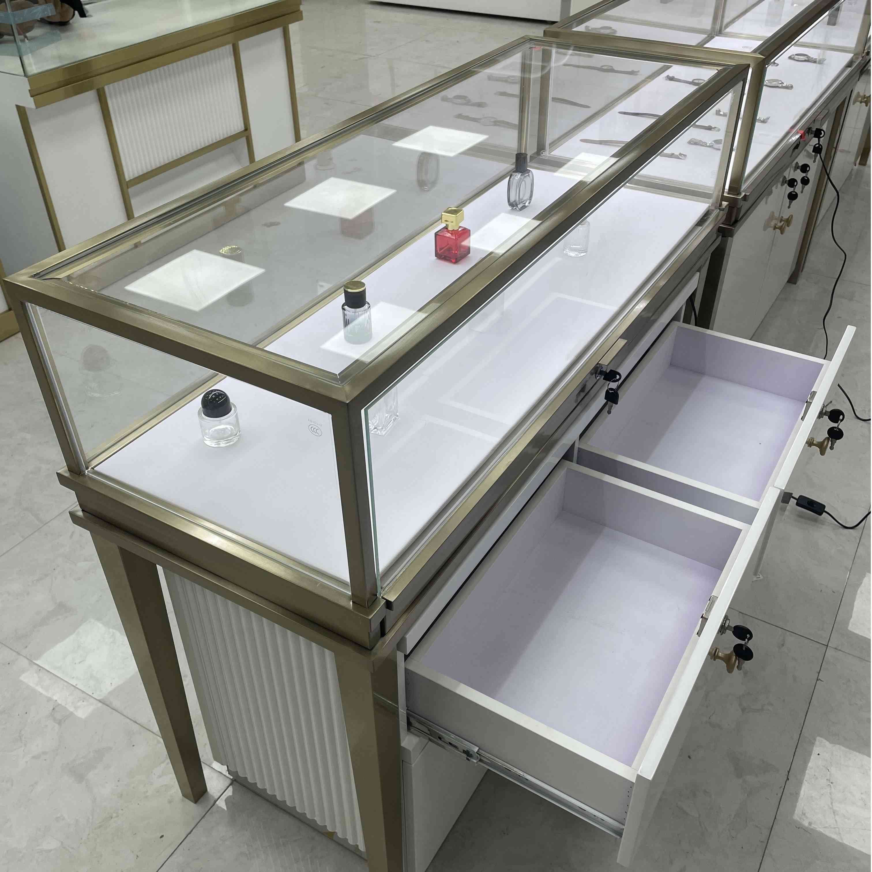 Este é um gabinete de exibição de joalheria com dimensões de L120*W55*H95cm. É uma peça personalizada que exala a elegância e a funcionalidade. Ela possui uma estrutura escovada de aço inoxidável de ouro com champanhe feita personalizada, dando a ele uma aparência luxuosa. O interior está repleto de couro PU branco, fornecendo um cenário macio e elegante para jóias. O gabinete de base branca possui gavetas de duas camadas, oferecendo espaço de armazenamento conveniente. Essas gavetas oferecem amplo espaço de armazenamento, essencial para uma joalheria.