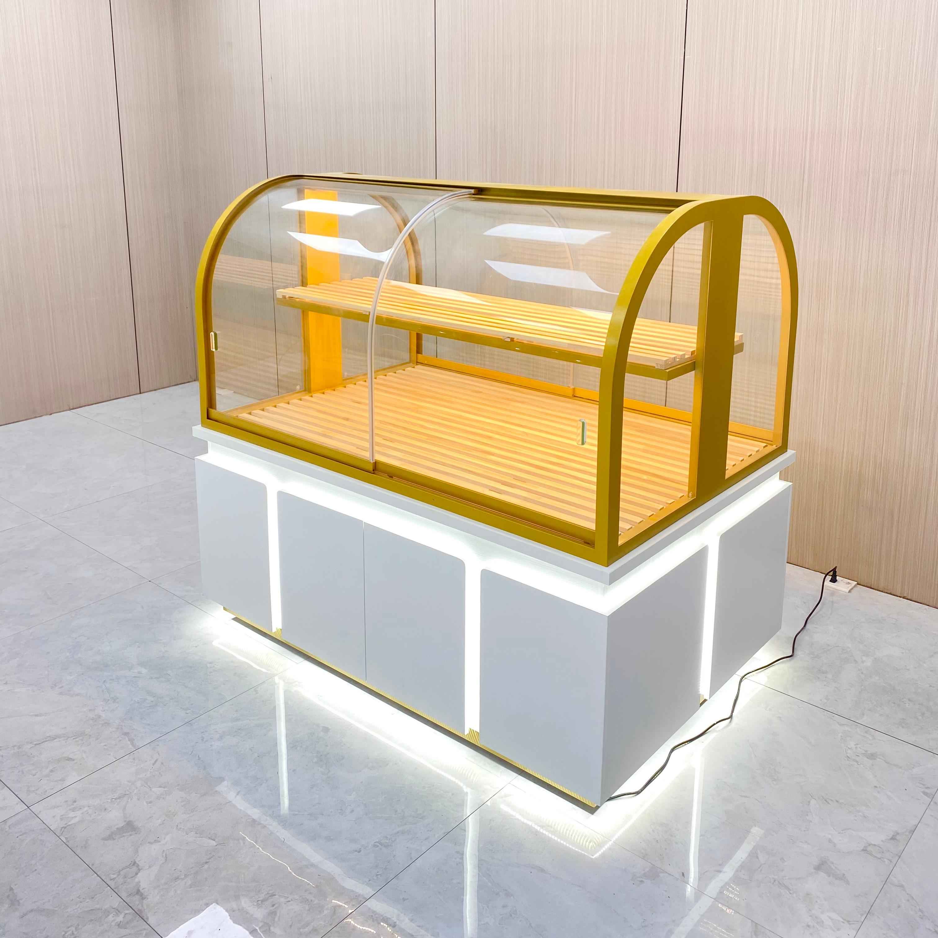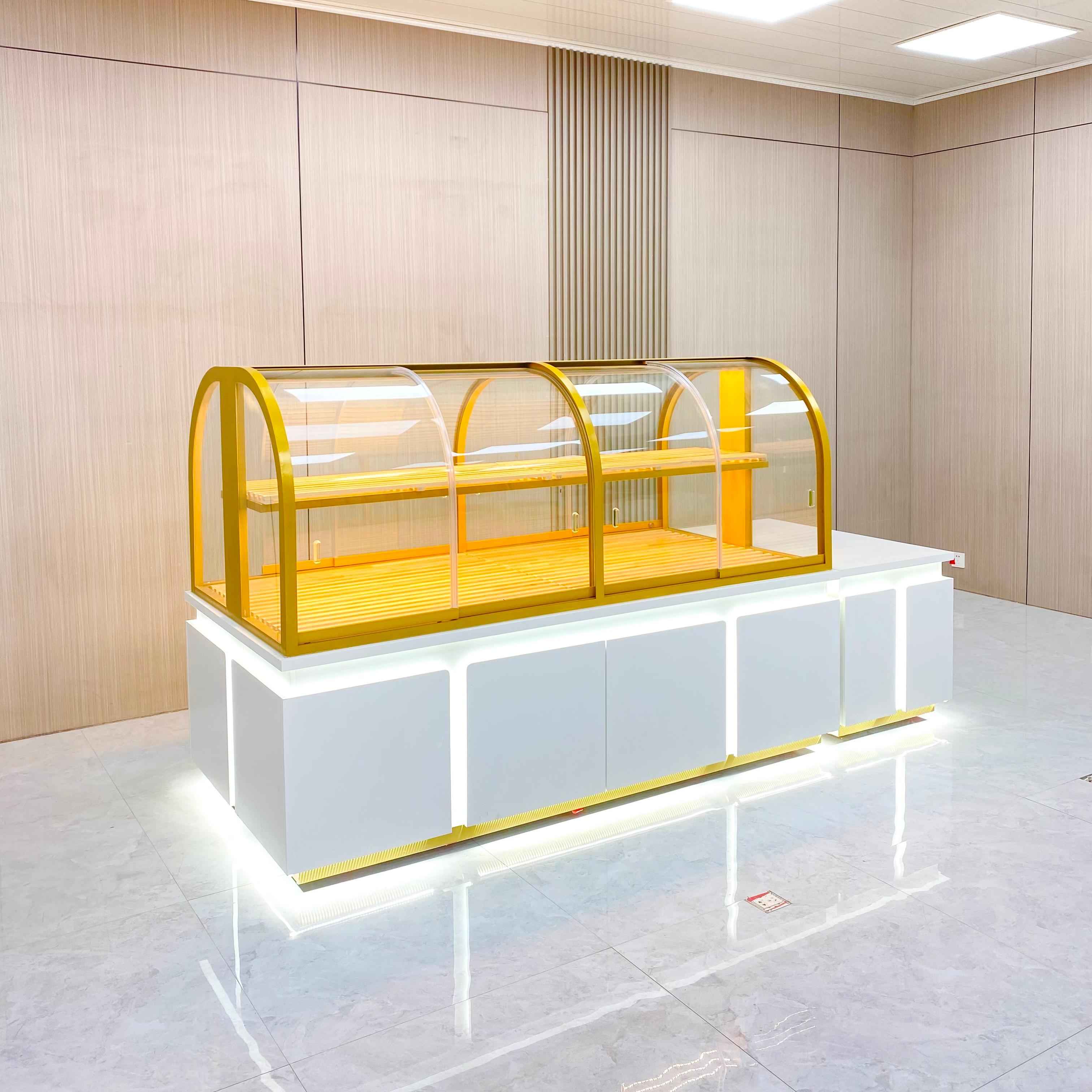 O gabinete de padaria de estilo simples é uma unidade de exibição de alta qualidade. O tamanho é L150*W100*H140CM. Possui uma estrutura de aço inoxidável, que fornece durabilidade e uma aparência elegante. O gabinete está equipado com vidro temperado transparente de 8 mm, garantindo a segurança e uma visão clara dos itens internos. As portas de vidro deslizantes permitem fácil acesso, mantendo o conteúdo fresco e visível. O gabinete base é feito com um acabamento de tinta assada, aumentando a estética geral e a robustez da tela. Além disso, ele é equipado com luzes LED para iluminar a tela, destacando os assados de uma maneira atraente.