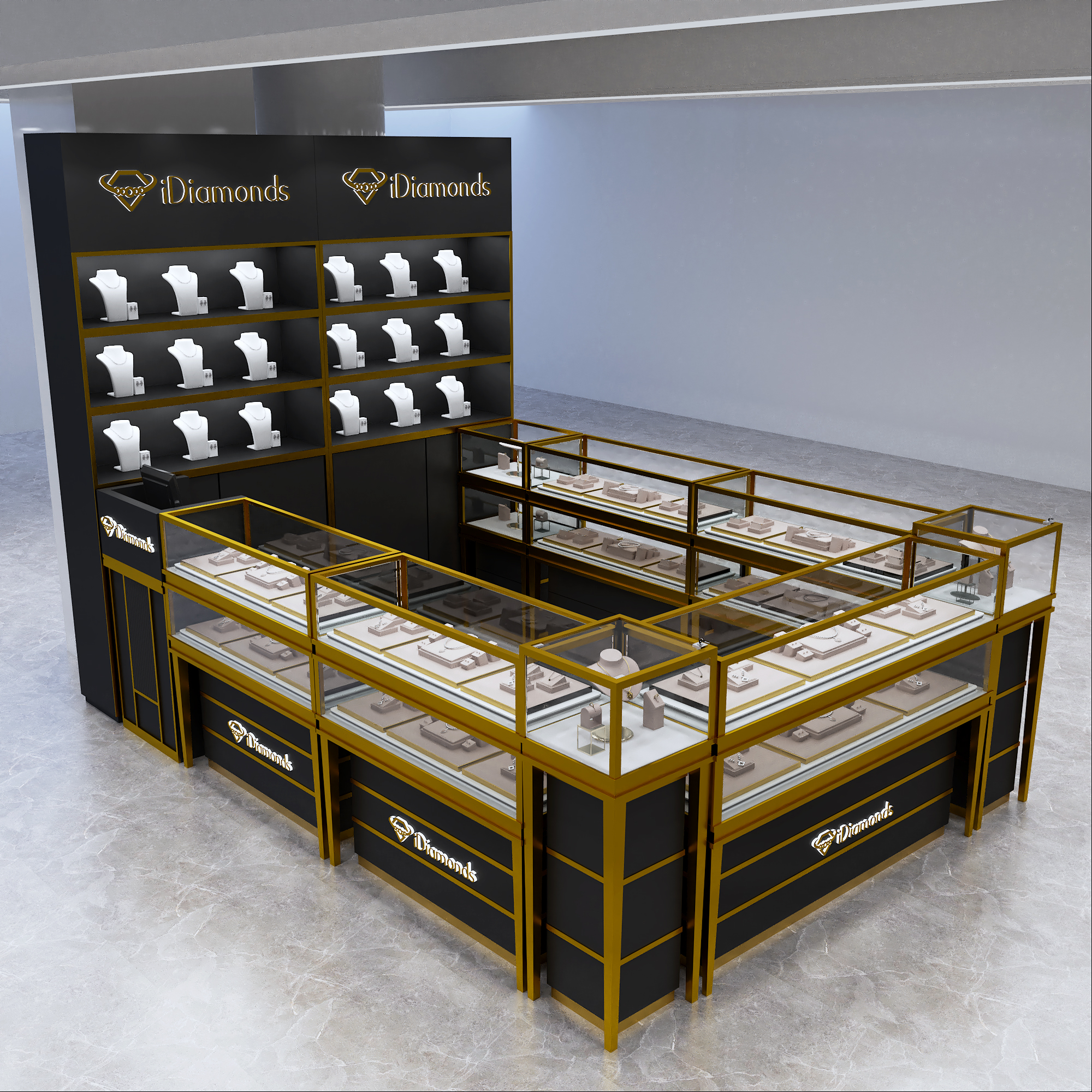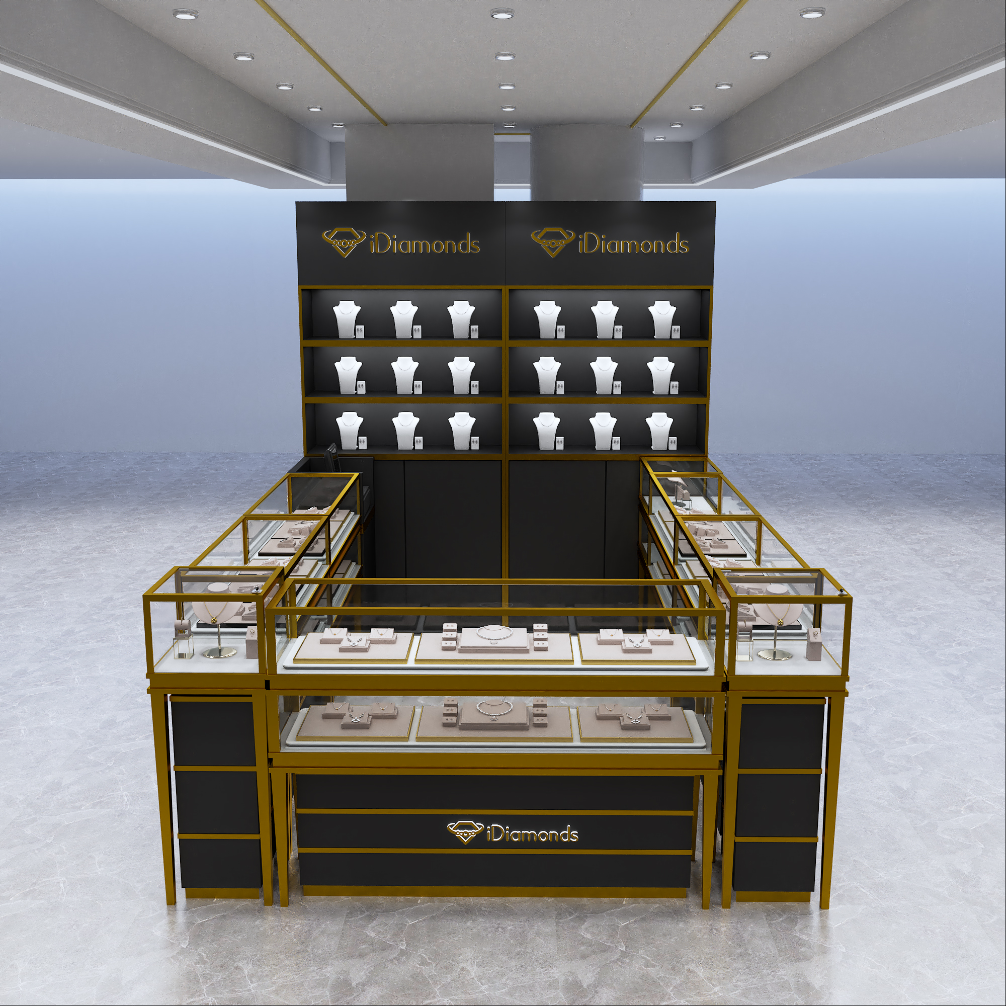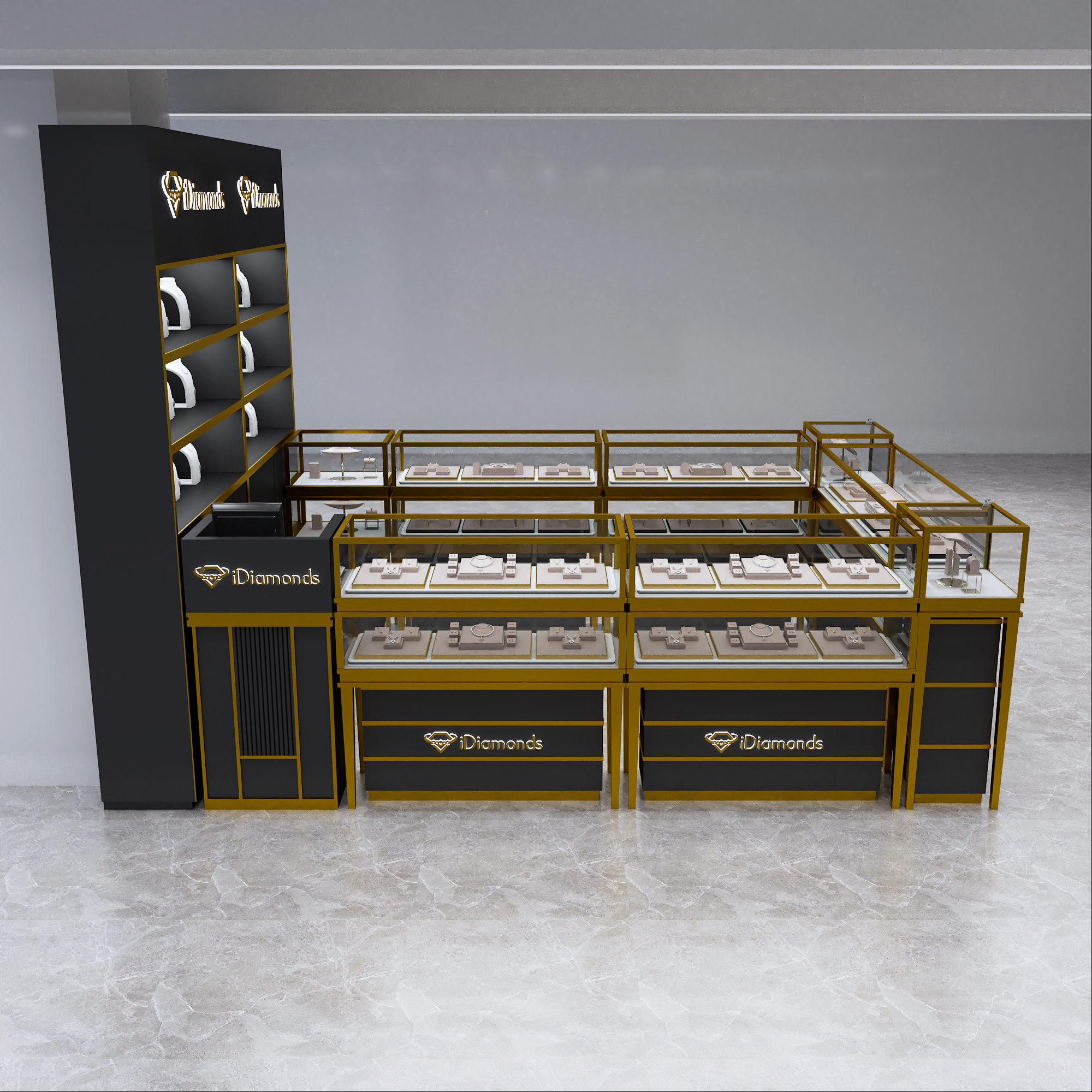 Apresentando nosso sofisticado quiosque de jóias de dois andares pretas, projetado para elevar seu espaço de varejo com elegância e funcionalidade. Este quiosque elegante e moderno apresenta dois níveis de exibição, proporcionando amplo espaço para a sua requintada coleção de jóias. Criados com materiais de alta qualidade e um elegante acabamento preto, este quiosque é a solução perfeita para mostrar seus produtos em grande estilo. Eleve sua experiência de varejo com nosso quiosque de joias de dois andares preto, projetado para impressionar e aprimorar o apelo estético da sua loja.