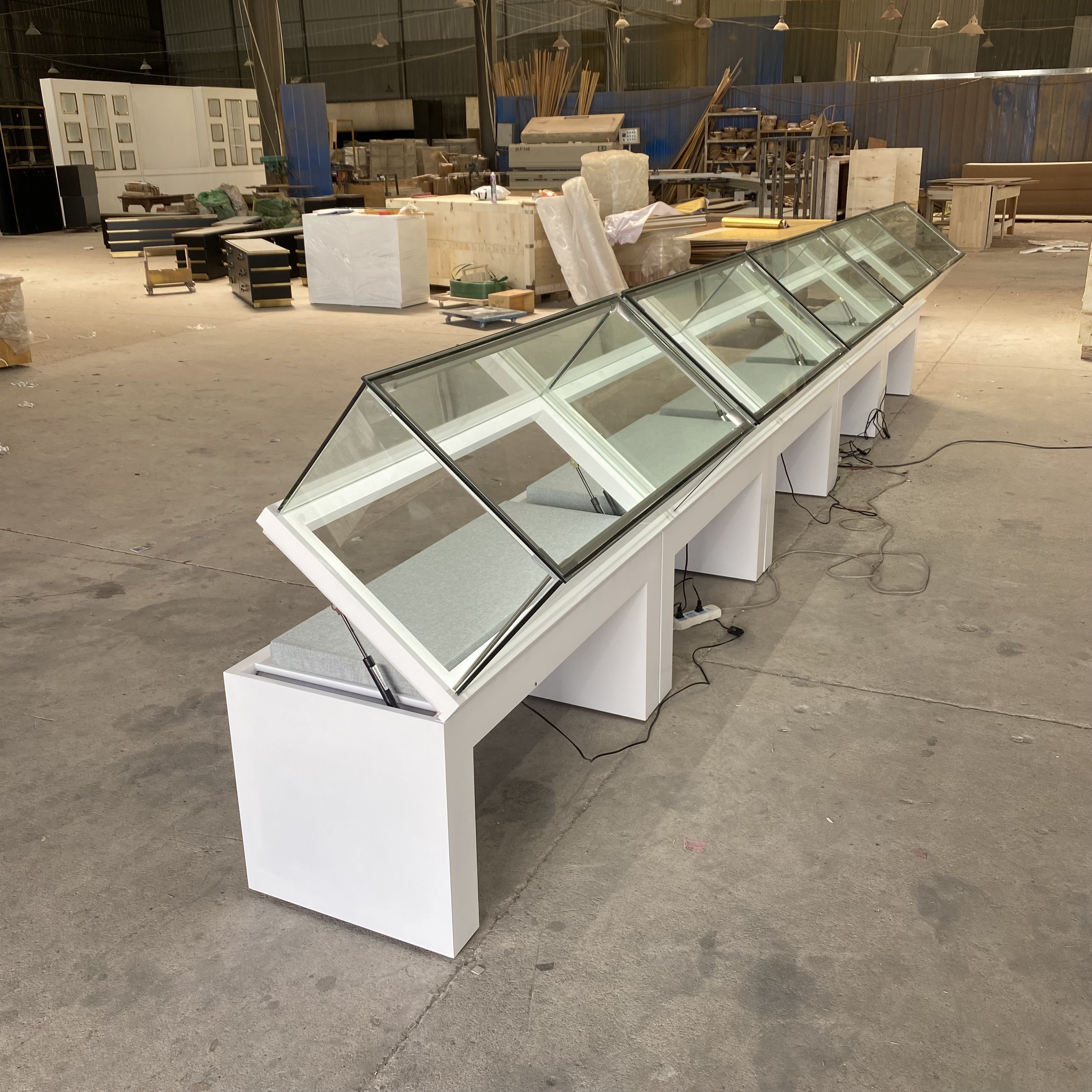 Jinxi Hongzhan Furniture Co., Ltd. é uma empresa dedicada envolvida no design e fabricação de estandes de exibição de bolo, suportes de exibição de pão, vitrines de armazenamento a frio, caixas de vidro para jóias e acessórios para lojas de vestuário. Nossa fábrica abrange 2.000 metros quadrados. Possuimos experiência em carpintaria, pintura e produção de aço inoxidável. Nossa equipe de design é altamente qualificada. Como uma fábrica abrangente, especializada em estandes de exibição de médio a ponta, com 18 anos de experiência e um compromisso com a satisfação do cliente, poliremos nossas habilidades para oferecer um serviço superior.